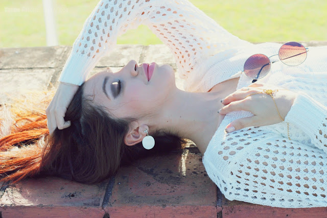 Olá, meus queridos leitores!!! Tudo bem? ;D Look das fotos: Casual boho romântico. Casaco branco furadinho de tricô e detalhes com franjas, Corselet jeans branco, Short jeans claro hot pants destroyed, Bolsa tiracolo caramelo com franjas, Cinto laranja com fivela grande, Óculos redondo dourado com lentes marrom degradê, Sandália rasteira laranja de couro, Unhas francesinha com brilhos e detalhes de renda preta. ^^ Espero que tenham gostado!!! E a maquiagem, o que acharam? Comentem, amores!!! Até mais. E bom final de semana para todos!!! Beijinhos ;*