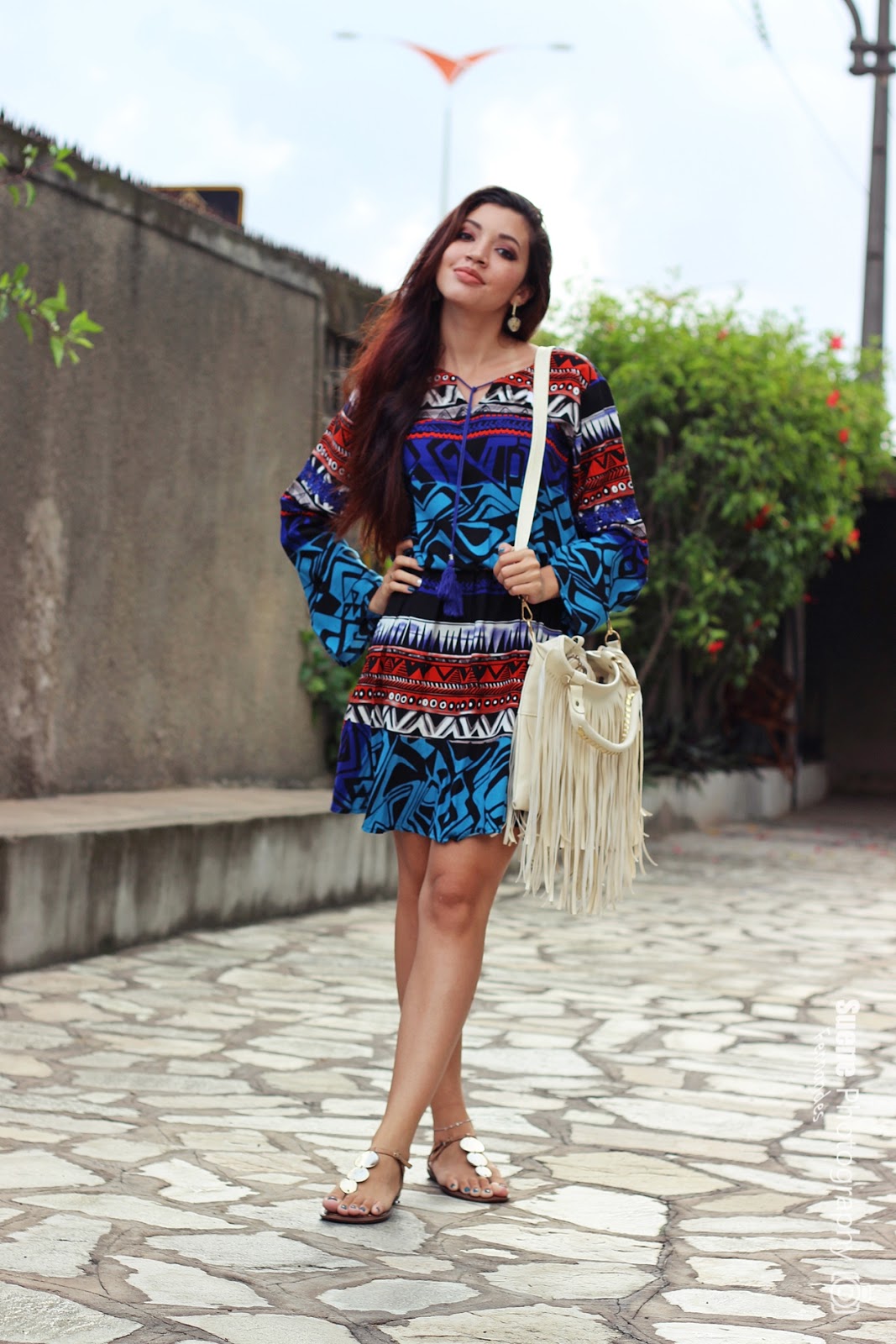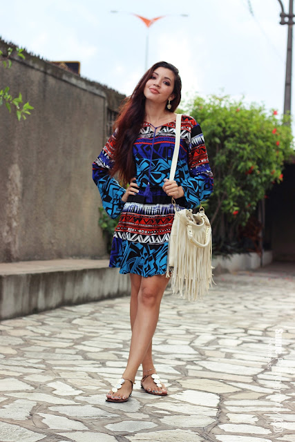 Olá, meus queridos leitores!!! ;D Tudo bem? Look das fotos: Vestido Com Estampa Étnica. Vestido azul e laranja com estampa étnica, Bolsa tiracolo bege com franjas, Rasteirinha dourada, Unhas azul com detalhes com glitter e branco. Espero que tenham gostado!! ^^ E a maquiagem? Comentem, amores!!! Até mais. Boa semana para todos!!! S2 Beijinhos ;*